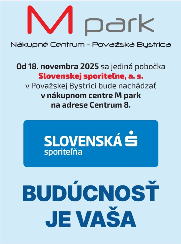Slovenská sporiteľna, a.s. Od 18. novembra 2025 sa jediná pobočka Slovenskej sporiteľne, a.s. v Považskej Bystrici bude nachádzať v nákupnom centre M park na adrese Centrum 8. Tešíme sa na Vás